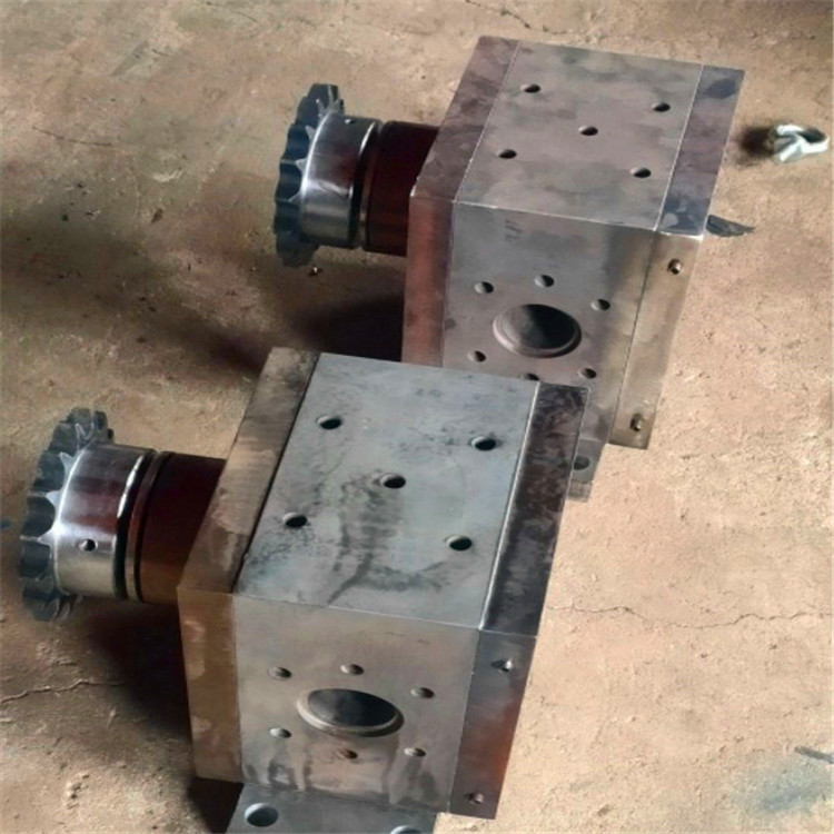 工作原理属于正位移泵,工作时依靠主、从动齿轮的相互啮合造成工作容积变化来输送熔体。工作容积由泵体、齿轮的齿槽及具有侧板功能的轴承套构成。当齿轮旋转时,熔体即进入吸入腔两齿轮的齿槽中,随着转动,熔体从两侧被带入排出腔,齿轮啮合,使齿槽中的熔体被挤出排出腔,压送到出口管道。轴承不能使用通常的润滑油脂,以避免污染熔体,通常采用熔体自润滑。